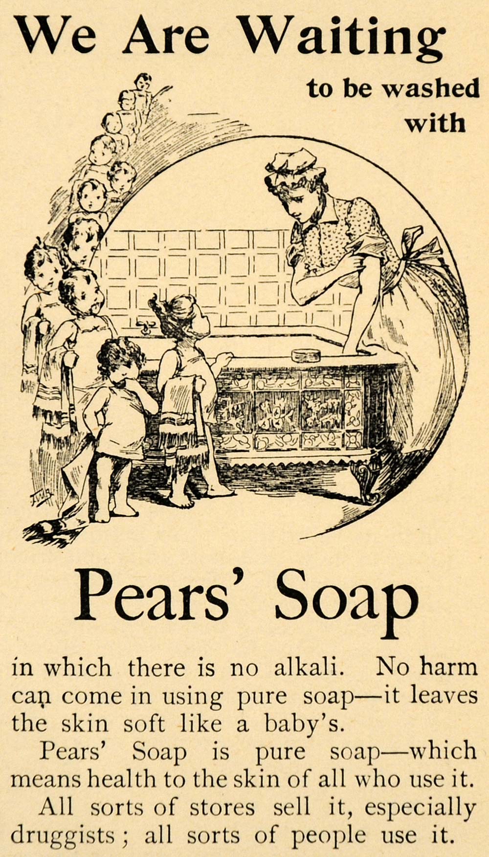 This is a small original 1893 black and white print ad for the Pears’ Soap from A. & F. Pears Ltd.