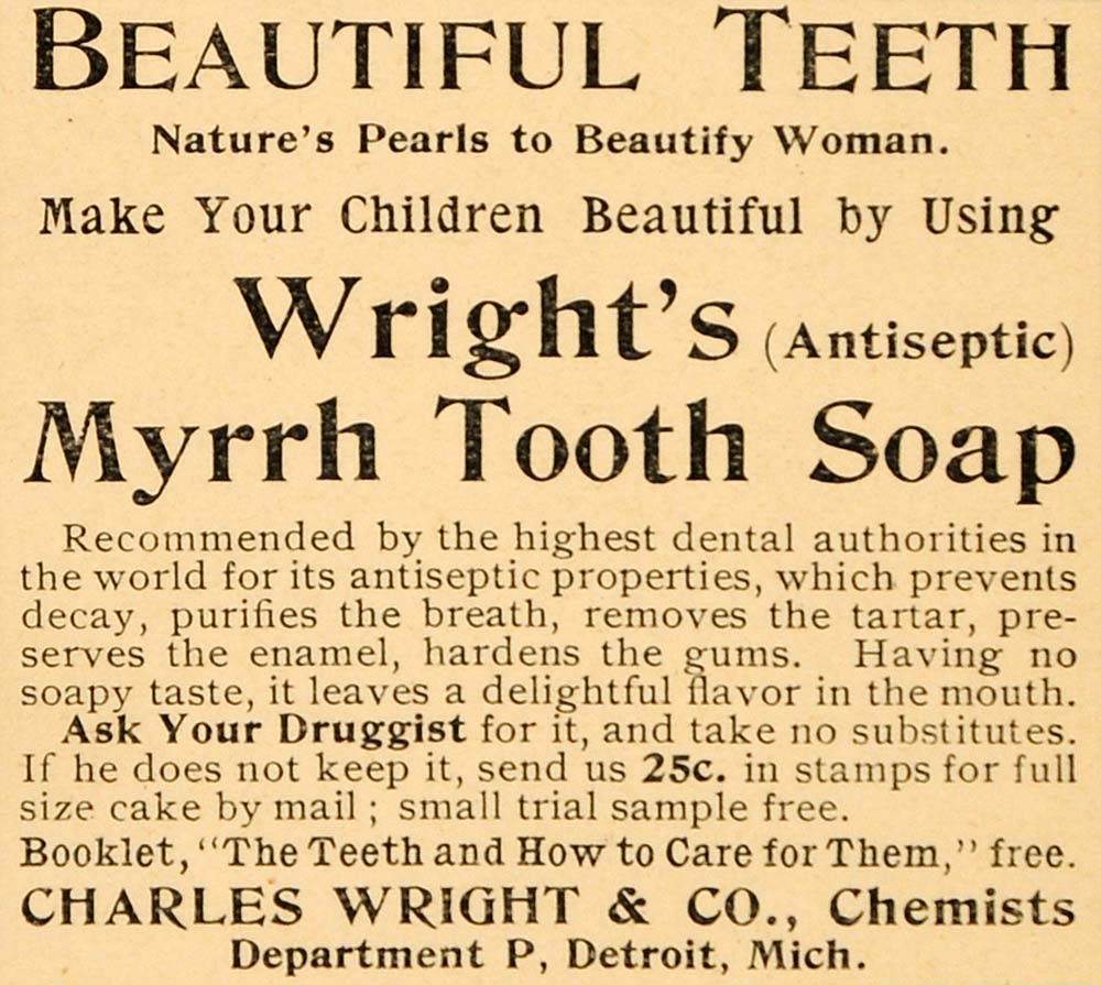 This is an original 1895 black and white print ad for Wright’s (Antiseptic) Myrrh Tooth Soap by Charles Wright and Company, Chemists located at Department P, Detroit, Michigan. Myrrh Tooth Soap prevents decay, purifies the breath, removes tartar and has a pre soapy taste.