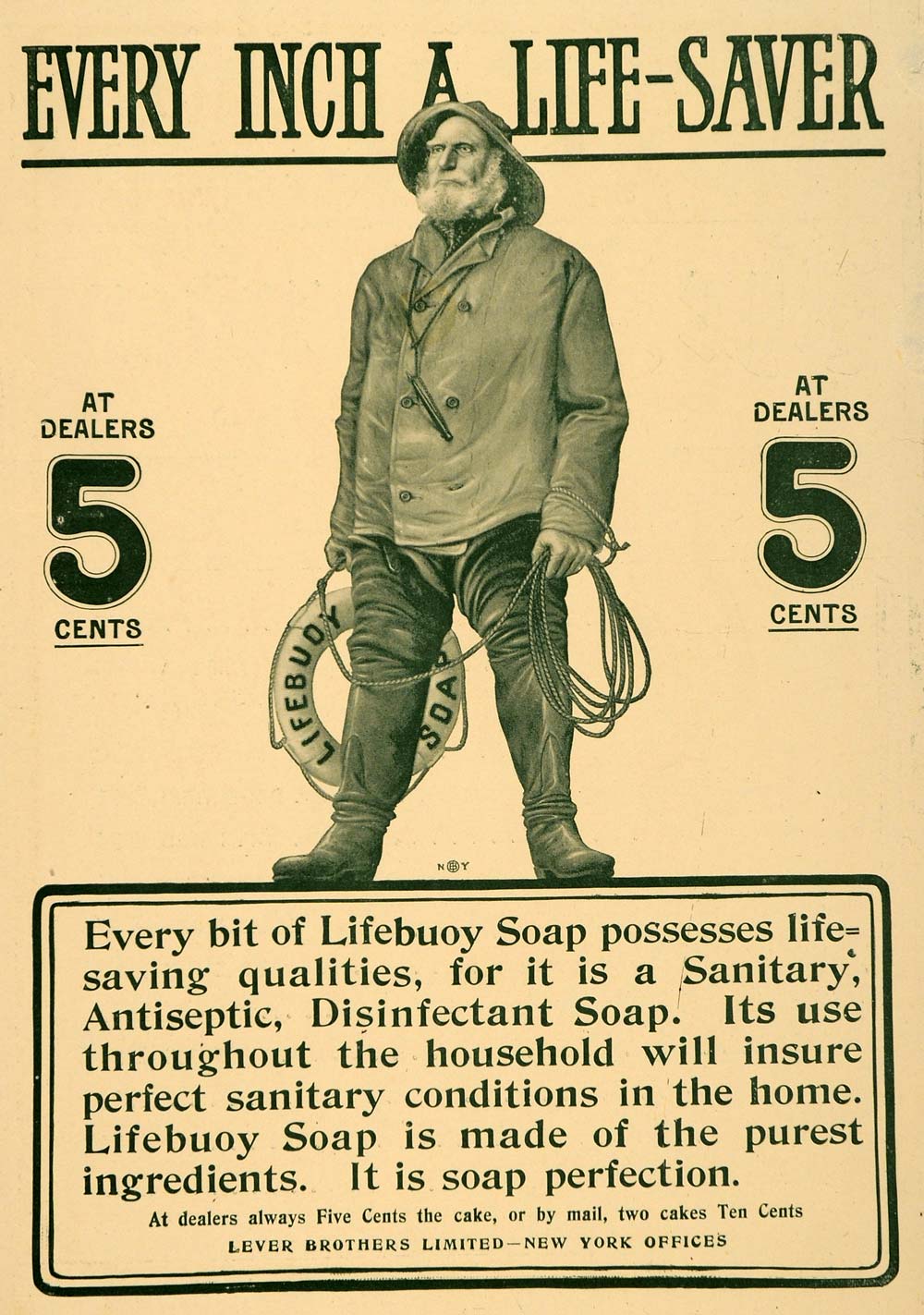 This is an original 1902 color print ad for Lifebuoy Soap from Lever Brother Limited located in New York. This ad shows a fisherman with a life saver, ready to help when the time comes.