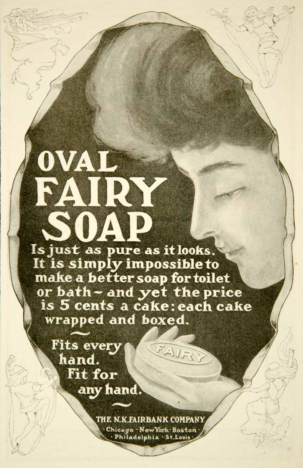 This is an original 1902 black and white print ad for Oval Fairy soap that was made and sold by the NK Fairbank Company during the Victorian era.