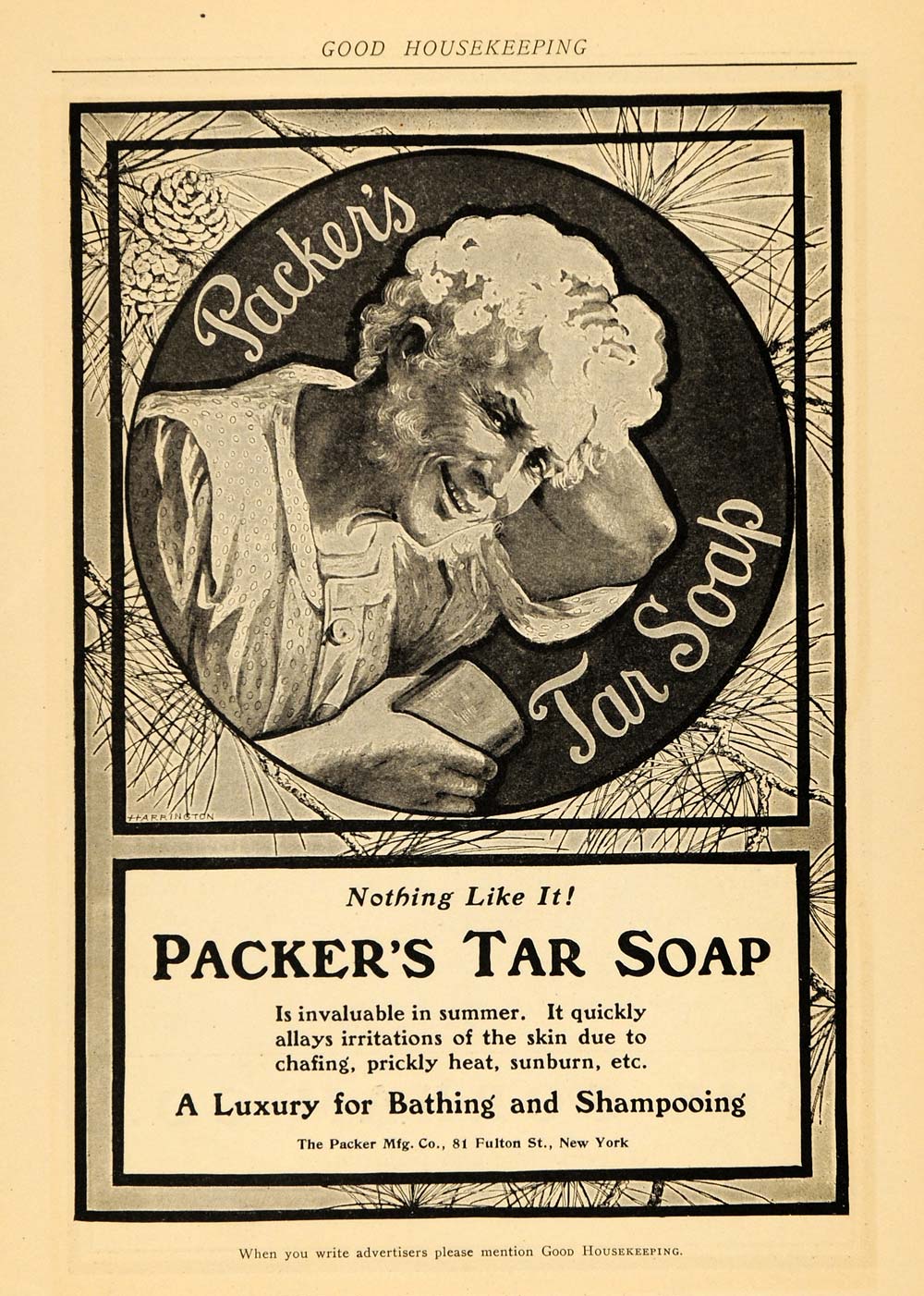 PackerÕs Pine Tar Soap exploited the substance and used it medicinally in their soap to aid in the treatment of such skin diseases as psoriasis, eczema, rosacea and more. PackerÕs Tar Soap originated in 1869, and was used as a common household toiletry in the bath, as a shampoo and in the nursery. The companyÕs famous slogan was ÒPure As The Pines.Ó