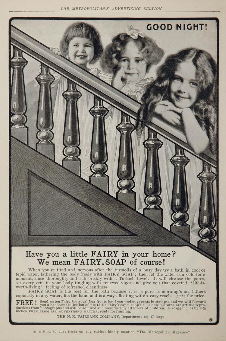 “Have you a Little Fairy in your home?” This is an original 1904 black and white print ad for Fairy Soap from The N. K. Fairbank Company of Chicago.