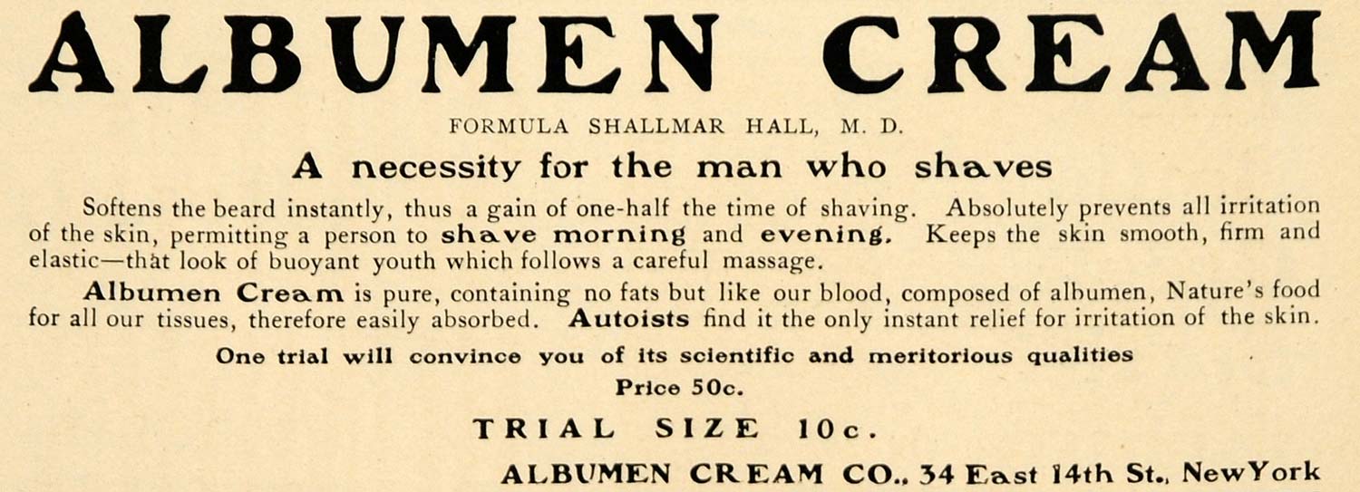 This is an original 1906 black and white print ad for the Albumen Cream Company, located at 34 East 14th Street in New York. This ad features their Albumen shaving Cream, a formula made by Shallmar Hall, M. D.