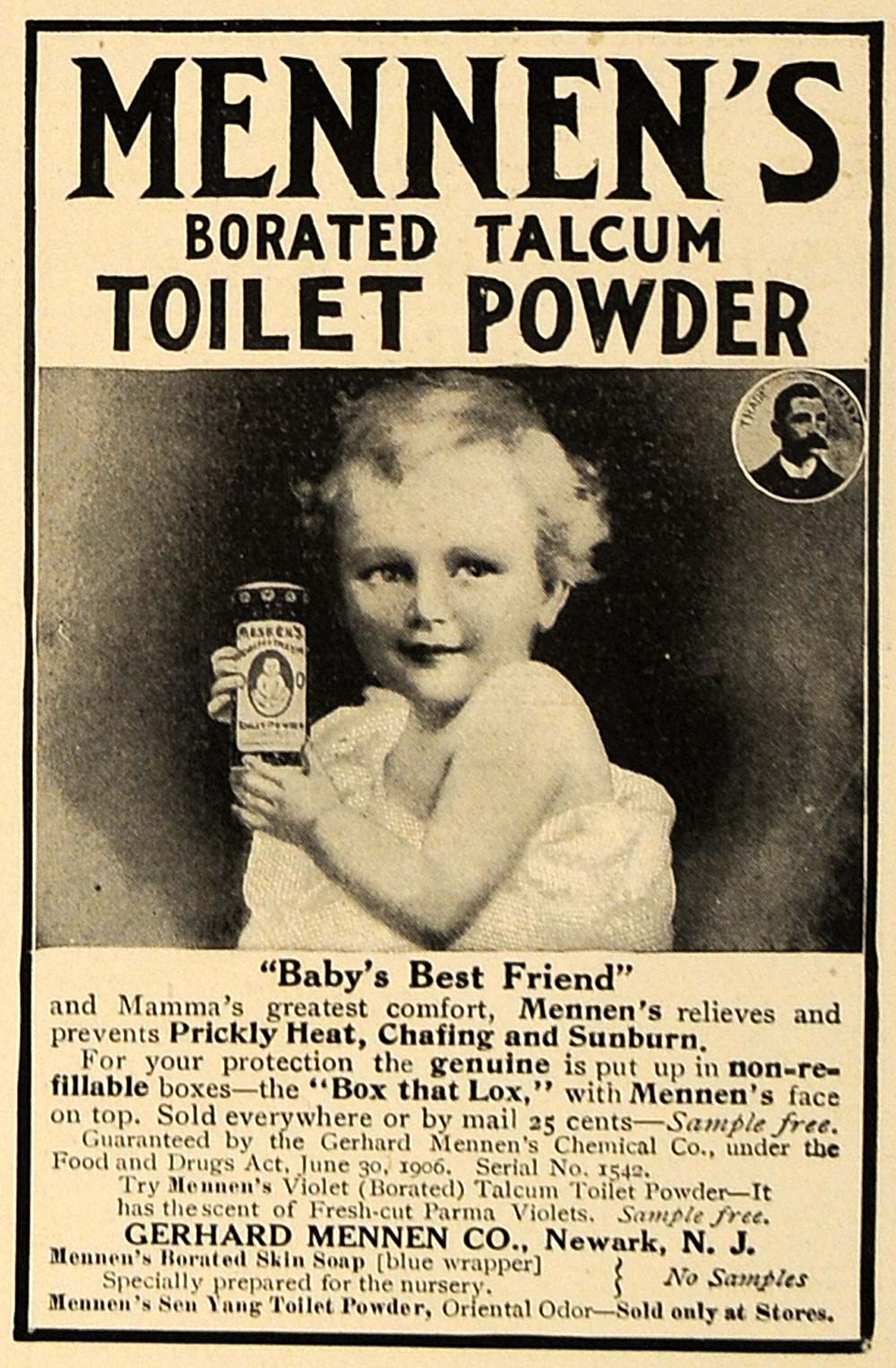 This is an original 1909 black and white print ad for Mennen’s Borated Talcum Toilet Powder by Gerhard Mennen Company located in Newark, New Jersey.