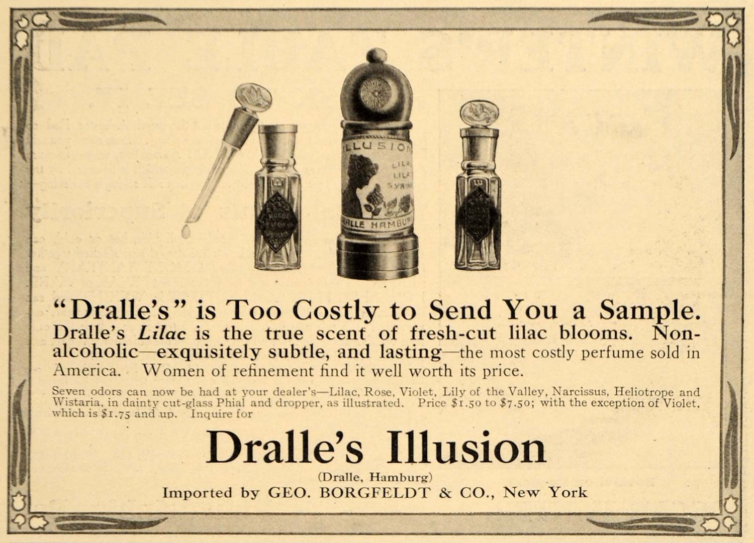 This is an original 1912 black and white print ad promoting the Dralle’s Illusion perfumes from Geo. Borgfeldt & Company, New York.