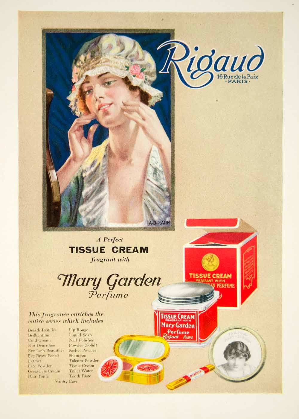 This is an original 1920 color print ad for Mary Garden Tissue Cream and Perfume from Rigaud of Paris.