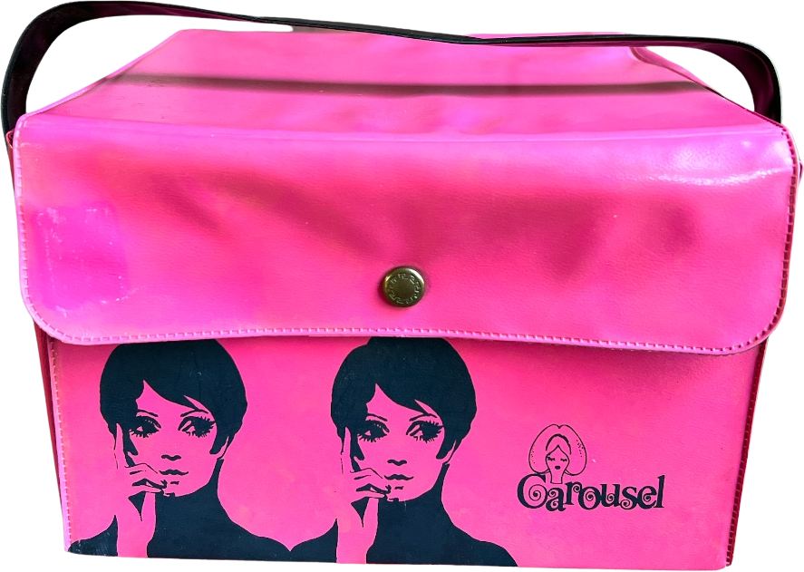 Mod woman graphic print on a hot pink top handle wig box by Carousel!