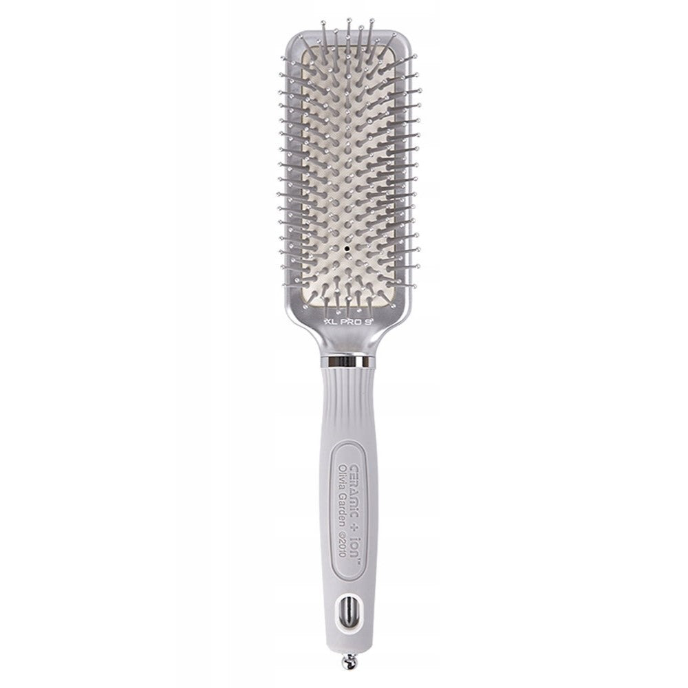 XL Pro Paddle Ceramic+Ion to profesjonalna szczotka do rozczesywania włosów stworzona przez markę Olivia Garden. Szczotka została wykonana z najwyższą dbałością o szczegóły z wysokiej jakości materiałów. XL Pro Paddle Ceramic+Ion posiada jonizowany korpus, dzięki czemu nie elektryzuje włosów. Okrągłe, nylonowe ząbki umieszczone na miękkiej poduszce są łagodne dla włosów oraz skóry głowy. Wygładza włosy oraz dodaje im blasku. Zastosowanie technologii Tourmaline-Ion sprawia, że łuski włosów są zamykane podczas czesania, co przyczynia się do redukcji elektryzowania się i przesuszania się włókien włosów.